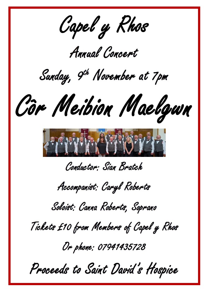 Côr Meibion Maelgwn will be performing at the Annual Concert in Capel y Rhos on Sunday evening, 9th November. Also appearing will be Canna Roberts, talented Soprano.